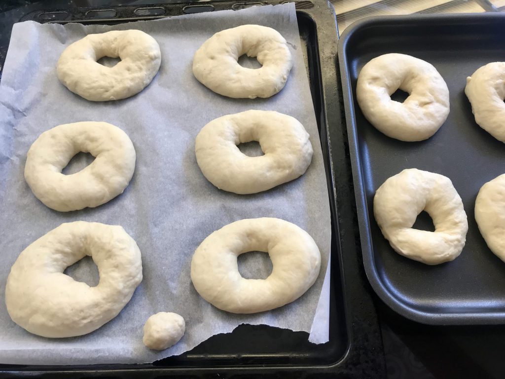Neem het gerezen deeg terug, leg het op een licht met bloem bestoven werkblad, rol het op zichzelf op om een rol te vormen, snijd er 10 gelijke stukken van. Rol elk stuk met de palm van je hand om balletjes te vormen die je in het midden doorboort om je ringen te maken die je op een met bakpapier beklede bakplaat laat rusten. Bedek je ringen met een doek en laat ze minstens 30 minuten rusten voor het deeg met gist, terwijl het met zuurdesem minstens 1 uur moet rusten.