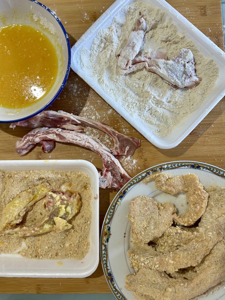 Het vlees, dat vlees en vet combineert, geeft de koteletten een knapperige buitenkant en een zachte en sappige kern. Als je geen ervaring hebt, raad ik aan om de koteletten al gesneden bij de slager te kopen, maar ze kunnen ook thuis worden bereid met een goed mes, volgens de lijn van de ribbenkast. In beide gevallen is het belangrijk om het vlees goed te kloppen om het tijdens het koken malser te maken en te voorkomen dat het krimpt tijdens het frituren.