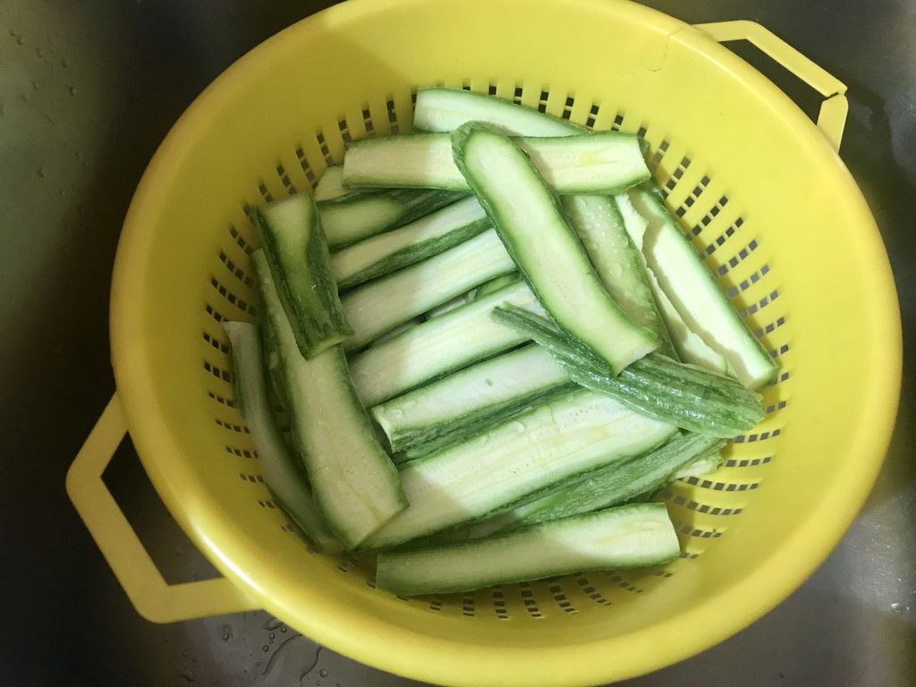 Snijd de courgettes in niet te dikke plakken, leg ze in een vergiet en bestrooi elke laag lichtjes met zout. Dit helpt om overtollig water te verwijderen, en je hoeft geen extra zout toe te voegen als je ze in de ovenschaal legt. Laat de courgettes zo ongeveer 20 minuten rusten, ik houd ze in de gootsteen maar onthoud dat ze wat vocht zullen verliezen.