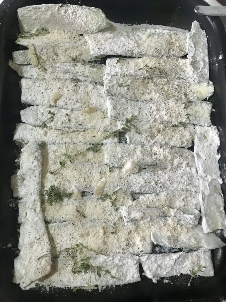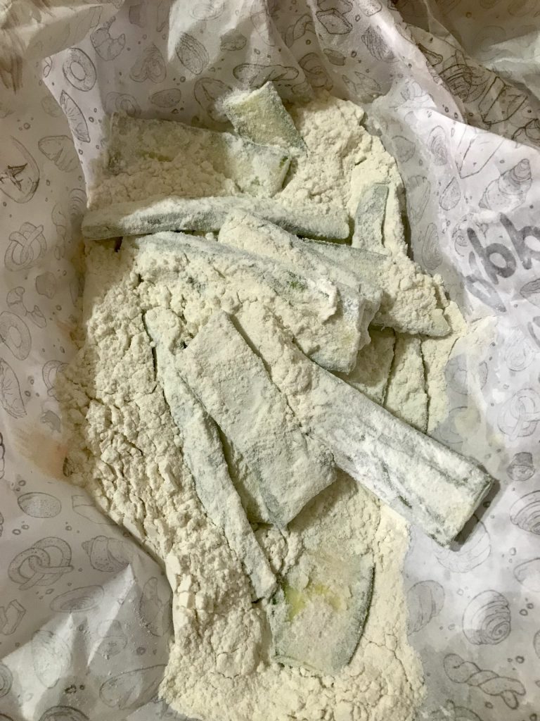 Na de rusttijd paneer je de courgettes door een papieren zak te gebruiken om ervoor te zorgen dat de bloem overal hecht.