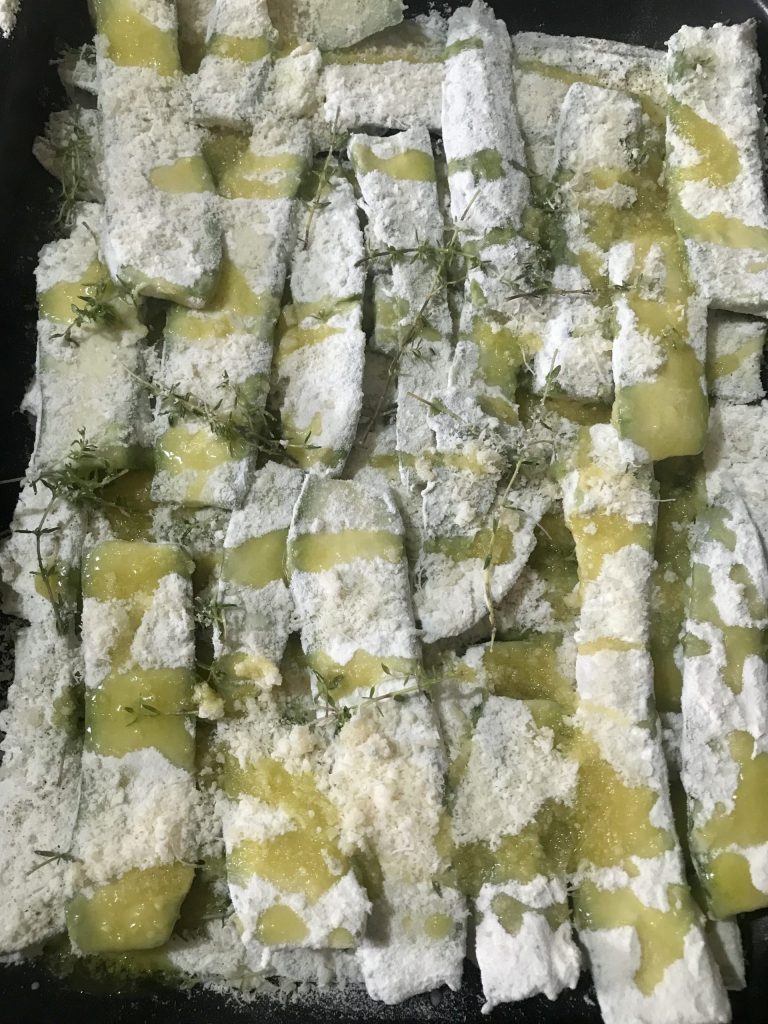 De lagen courgettes in de ovenschaal mogen niet meer dan drie zijn voor een snelle en goede bereiding. Elke laag moet alleen worden gekruid met Parmezaanse kaas, peper en tijm zonder zout omdat we dat eerder hebben gebruikt. Voeg pas bij de laatste laag, zoals op de foto te zien, de olie toe vlak voor het bakken.