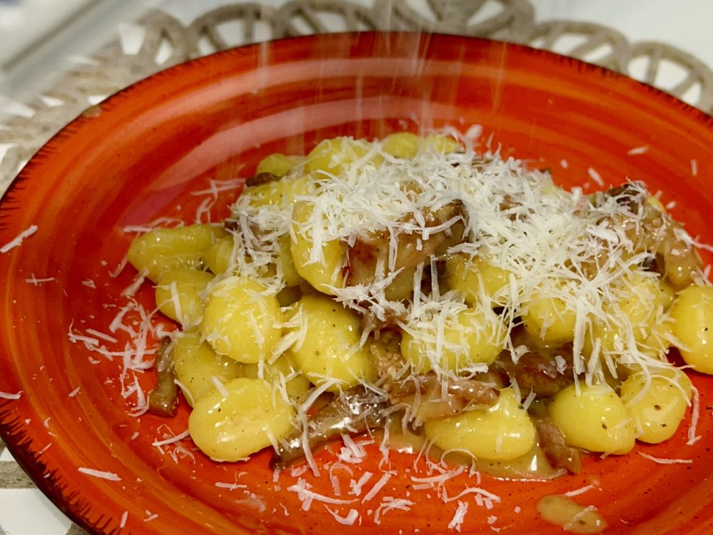 Gnocchetti alla carbonara, een romige en zeer smakelijke variant van de klassieke carbonara.