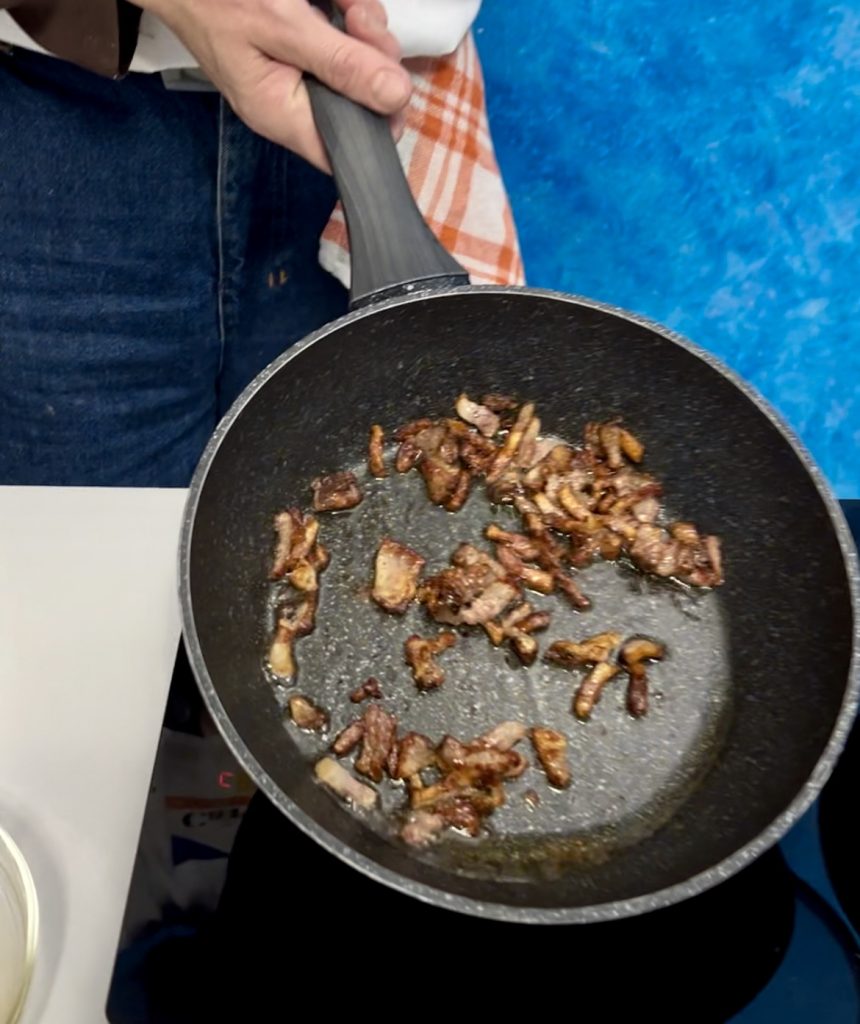 Verwarm de anti-aanbakpan goed en bak de guanciale rondom, waarbij je hem af en toe draait om te voorkomen dat hij verbrandt. Hij moet krokant worden aan de buitenkant en zacht aan de binnenkant. Zoals je op de foto ziet, hoef je geen extra olie toe te voegen omdat de guanciale zijn natuurlijke vet tijdens het bakken vrijgeeft. Mijn advies is om de guanciale te bakken met de deksel op de pan. Zodra de guanciale mooi krokant is, zet je de pan uit. Maak de eicrème door het hele ei en de eidooier in een kom te doen, waarbij je zout en peper naar smaak toevoegt. Wees voorzichtig met het toevoegen van zout omdat het recept Pecorino kaas vereist, die vrij zout is.