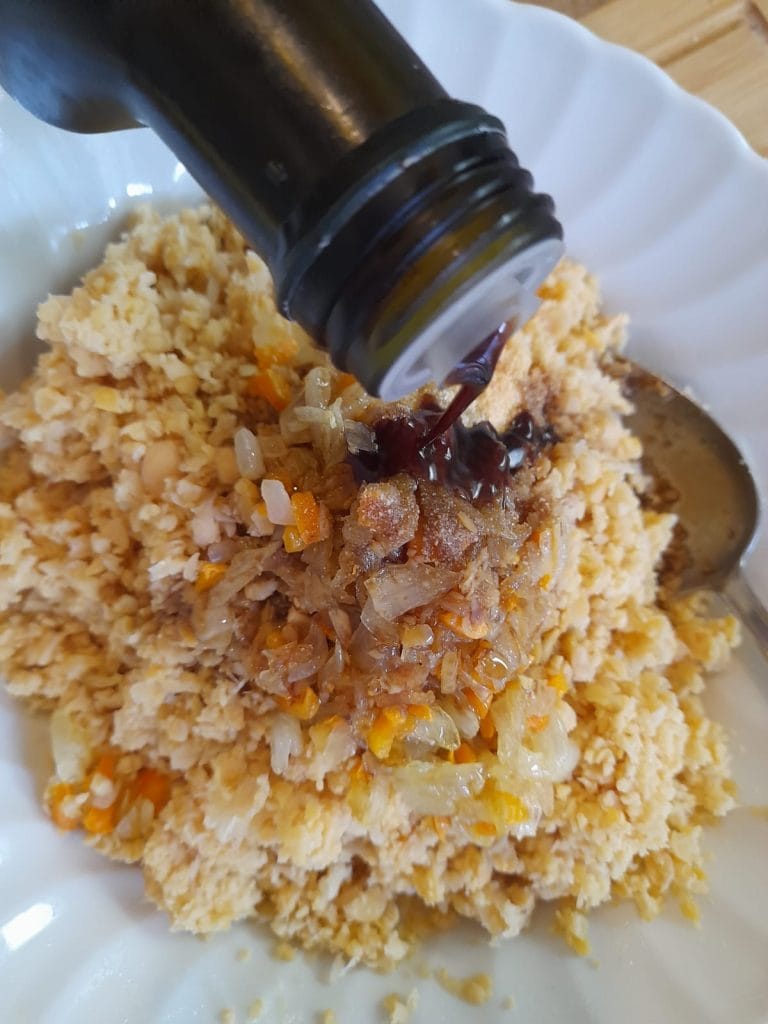 Als de soffritto klaar is, ga je verder met de bereiding van het deeg. Pureer de kikkererwten met een keukenmachine tot een homogeen mengsel. Ik raad aan om de kikkererwten goed te malen, maar niet te veel, want als er kleine stukjes overblijven, geven ze een interessantere textuur aan het deeg. Voeg dan de soffritto toe, een eetlepel sojasaus en het paneermeel (of als je dat verkiest, het kikkererwtenmeel) en meng goed tot je een stevig en goed gemengd deeg hebt.