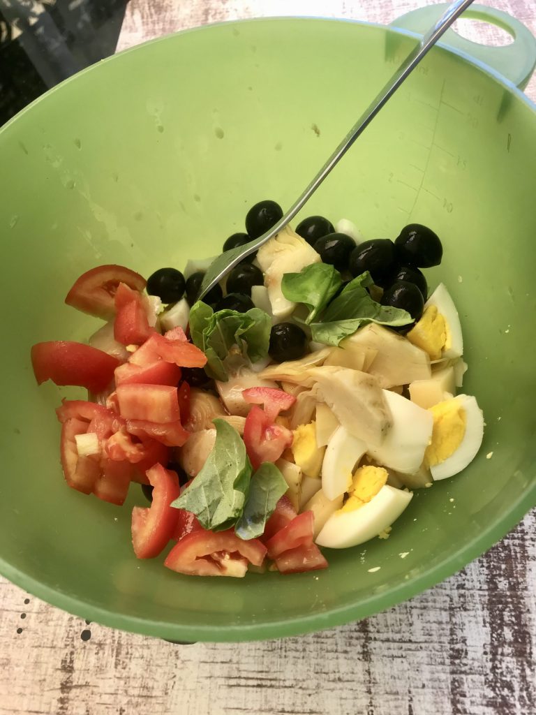 Terwijl het water aan de kook komt, kunt u de rest van de ingrediënten voorbereiden, snijd de artisjokharten, snijd de San Marzano tomaten en de gruyère in blokjes, voeg de zwarte olijven, zout, peper en olie toe, en voeg ten slotte de in stukken gesneden hardgekookte eieren toe.
