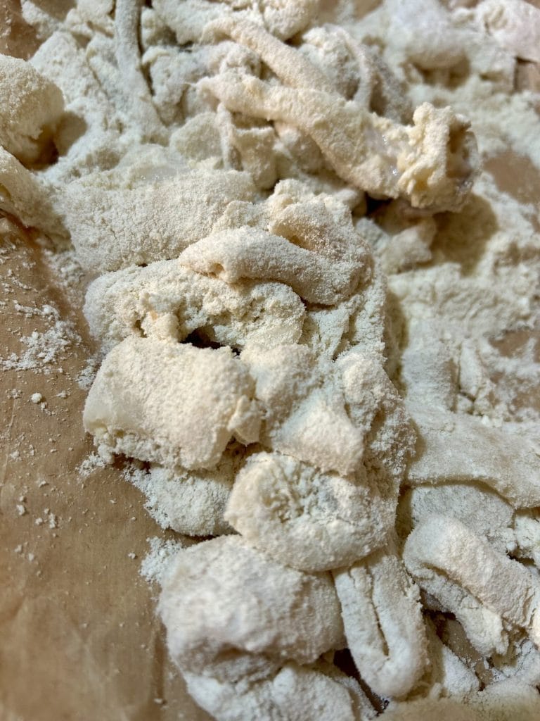 • Nu gaan we over naar het bebloemen: voor het gemak gebruik ik een papieren zak van het brood. We doen de bloem erin en voegen de calamares toe. We sluiten de zak goed en schudden deze lichtjes, geholpen door de randen om de bloem aan elke ring te laten hechten.