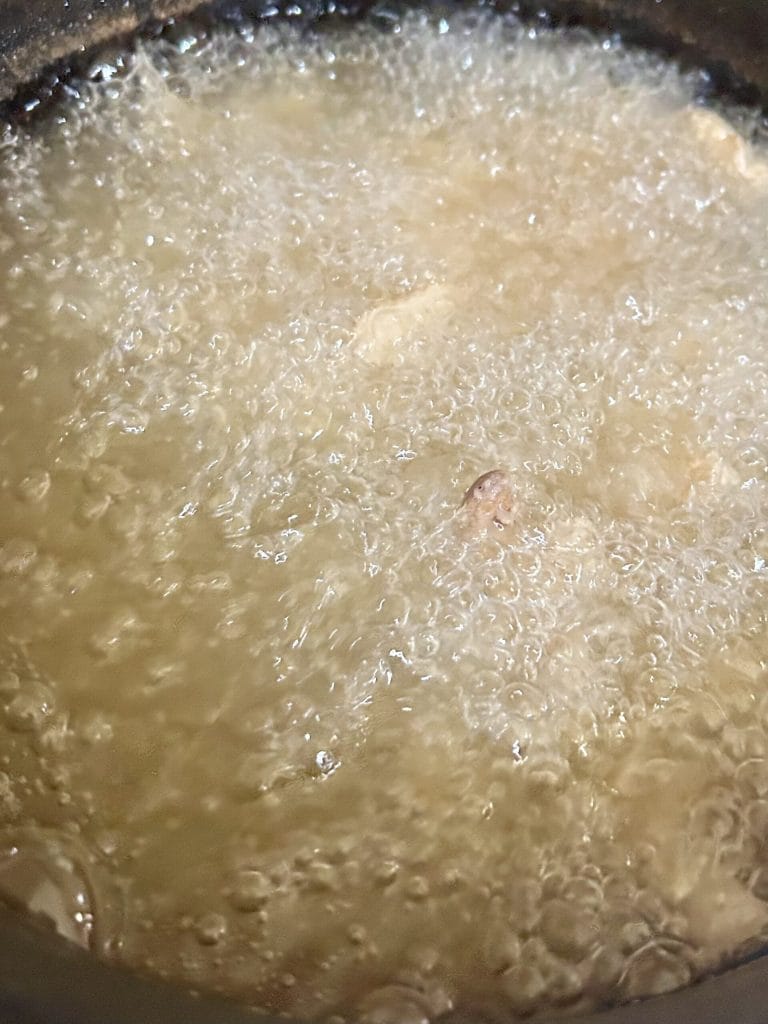 • Terwijl we de calamares bebloemen, brengen we de olie voor het frituren op het fornuis. Ik gebruik een pan met hoge randen, afgedekt met een deksel, zodat de temperatuur altijd stabiel blijft. De olie moet minstens 160°C bereiken: als we geen thermometer hebben, volstaat het om een tandenstoker onder te dompelen, en wanneer deze bedekt is met veel belletjes is de olie klaar.