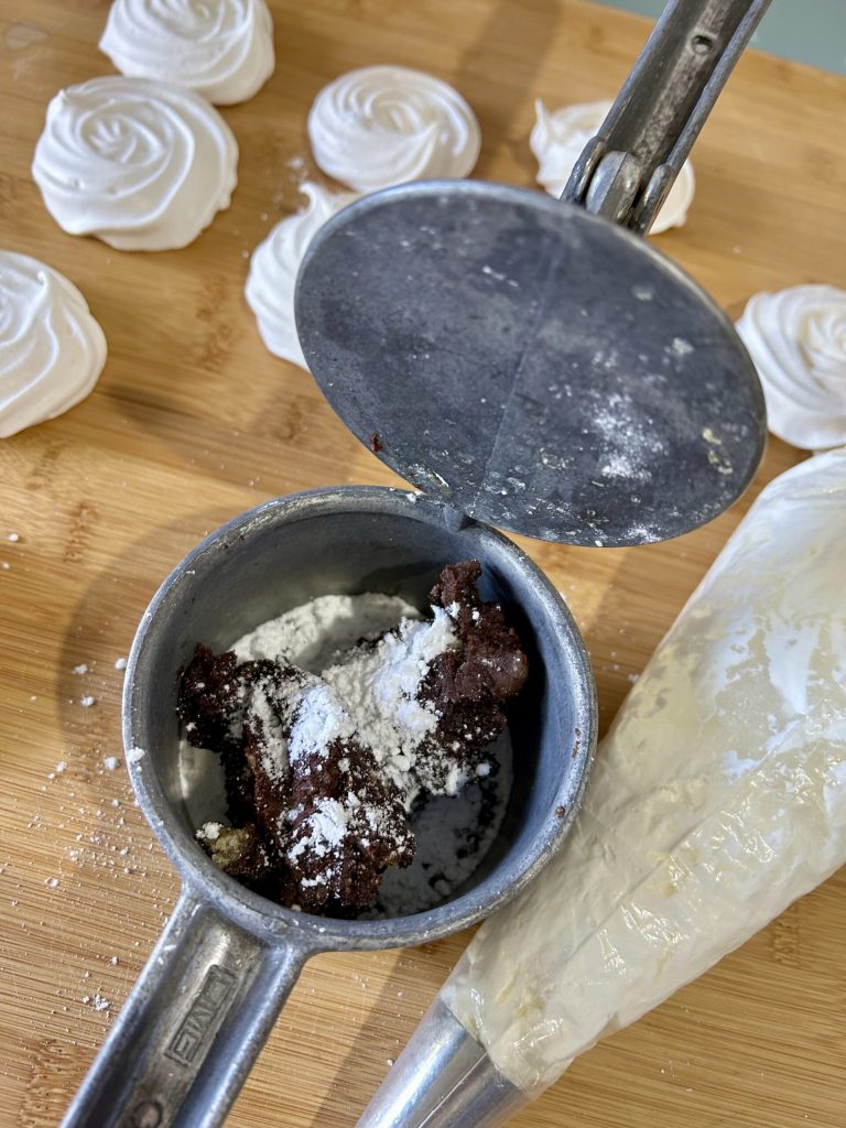 Nu bedekken we de meringues met toefjes kastanjedeeg. Om het gemakkelijker te maken, plaatst u het gemengde deeg in de aardappelpers en bestuift het met poedersuiker, omdat het deeg enigszins kleverig kan zijn.