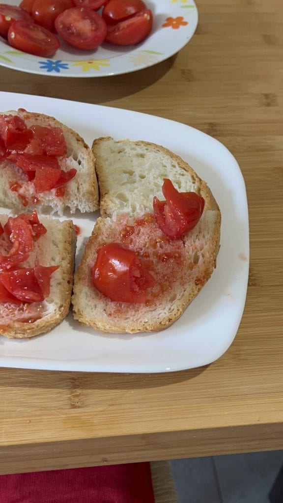 • Bereid de tomaten voor: na het goed wassen van de tomaten, snijd ze doormidden en wrijf ze direct op de plakken brood om al hun sap eruit te laten komen. De pulp die overblijft, breken we boven het brood, met de hand of met behulp van een mes, naar voorkeur.