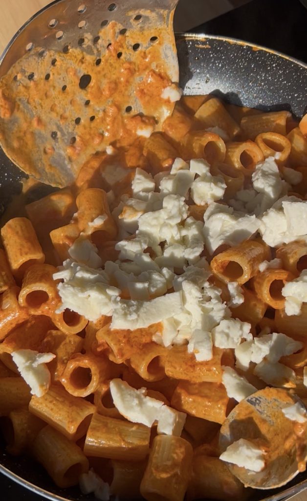 Traditioneel wordt het bereid met paccheri, maar ik heb gekozen voor mezze maniche, perfect om al het romige sausje op basis van room op te vangen en, met het vuur uit, in een magische draad te veranderen dankzij de mozzarella.