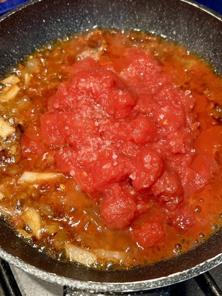 Wanneer het goed geroosterd is, voeg de tomatenpulp toe, breng op smaak met zout en laat ongeveer 5 minuten koken. Vervolgens zet je de kookplaat uit.