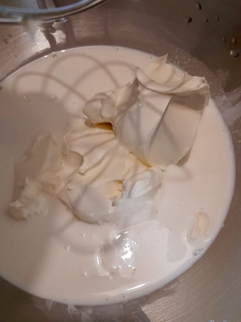In de kom van de keukenmachine voeg je de slagroom en de mascarpone toe. Begin ze voorzichtig te mengen om te voorkomen dat de mascarpone spettert, en verhoog dan de snelheid om ze goed op te kloppen tot een luchtig en goed gemonteerd mengsel.
