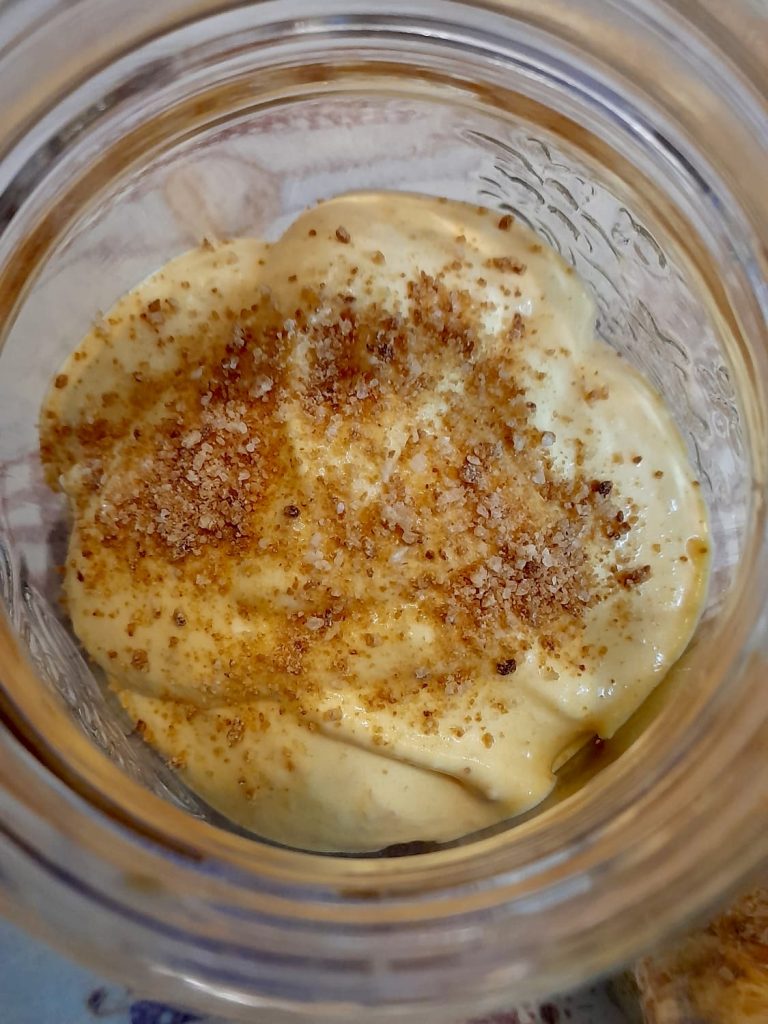 Bestrooi de crème met wat verkruimelde amaretti en ga door met het stapelen, waarbij je een nieuwe gedoopte savoiardo en een andere laag crème aan elk potje toevoegt. Herhaal dit tot alle ingrediënten op zijn, en eindig met een laag crème.