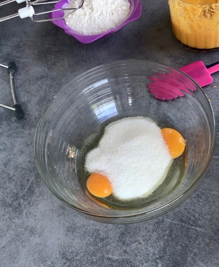 Doe de eieren met de suiker in een kom en klop ze goed met een elektrische garde.