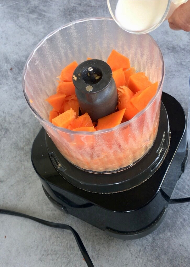 De eerste stap bij het bereiden van de pompoentaart is het goed pureren van de pompoen met plantaardige olie en melk tot een romige puree.