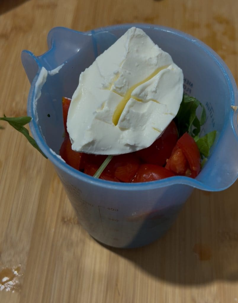 Ondertussen bereiden we de saus: in een hoge beker doen we de rucola, de gewassen en gehalveerde cherrytomaten en de smeerkaas. We voegen zout toe en een scheutje extra vergine olijfolie.