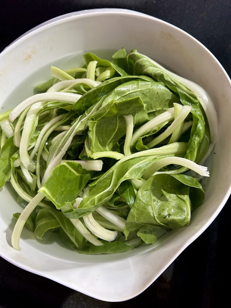 De eerste stap om het recept te starten is het schoonmaken van de snijbiet van het uiteinde van de stengel en het schillen van het laatste deel, vervolgens de stengel in tweeën delen en laten weken met water en zuiveringszout.