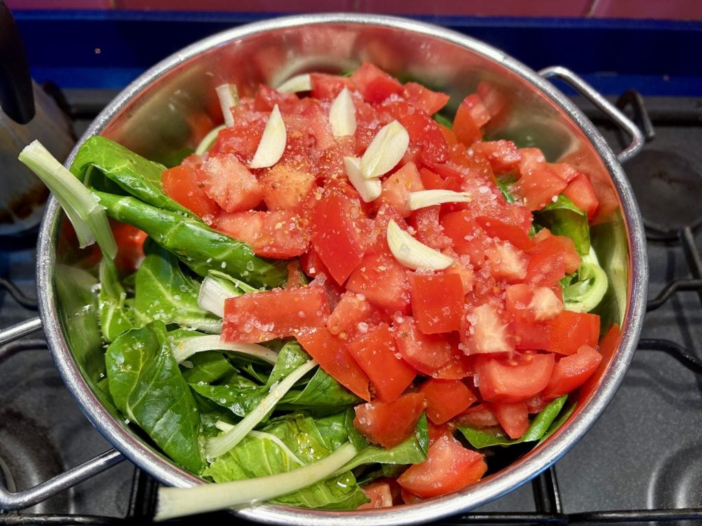 Spoel de snijbiet goed en doe het in de pan, voeg tomaat, zout, chilipeper, olie en grof gesneden knoflook toe.