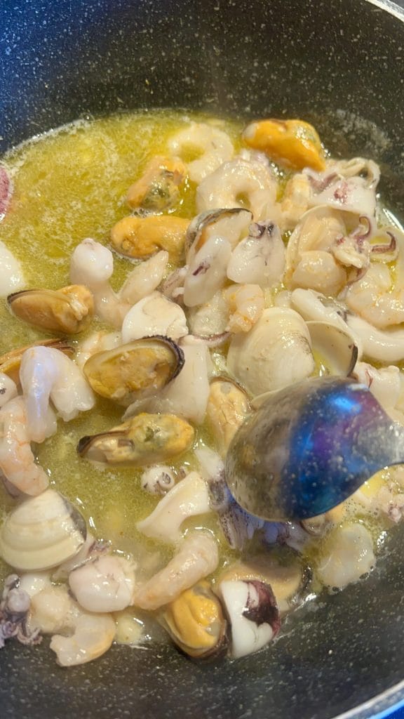• Zet een pan met ruim gezouten water op het vuur: deze heb je nodig om de spaghetti te koken zodra de saus klaar is. Intussen, in een koekenpan met hoge randen – zodat je het ook kunt gebruiken om de pasta in te bakken – giet een scheutje extra vergine olijfolie, voeg een teentje knoflook in stukjes en de peperoncino toe. Laat op middelhoog vuur fruiten totdat de knoflook goudbruin is. Op dit punt voeg je de nog bevroren gemengde vis toe, dek af met een deksel en laat 5 minuten op hoog vuur koken: de vis begint te ontdooien en geeft zijn natuurlijke water af, waardoor een smakelijke basis voor de saus ontstaat.