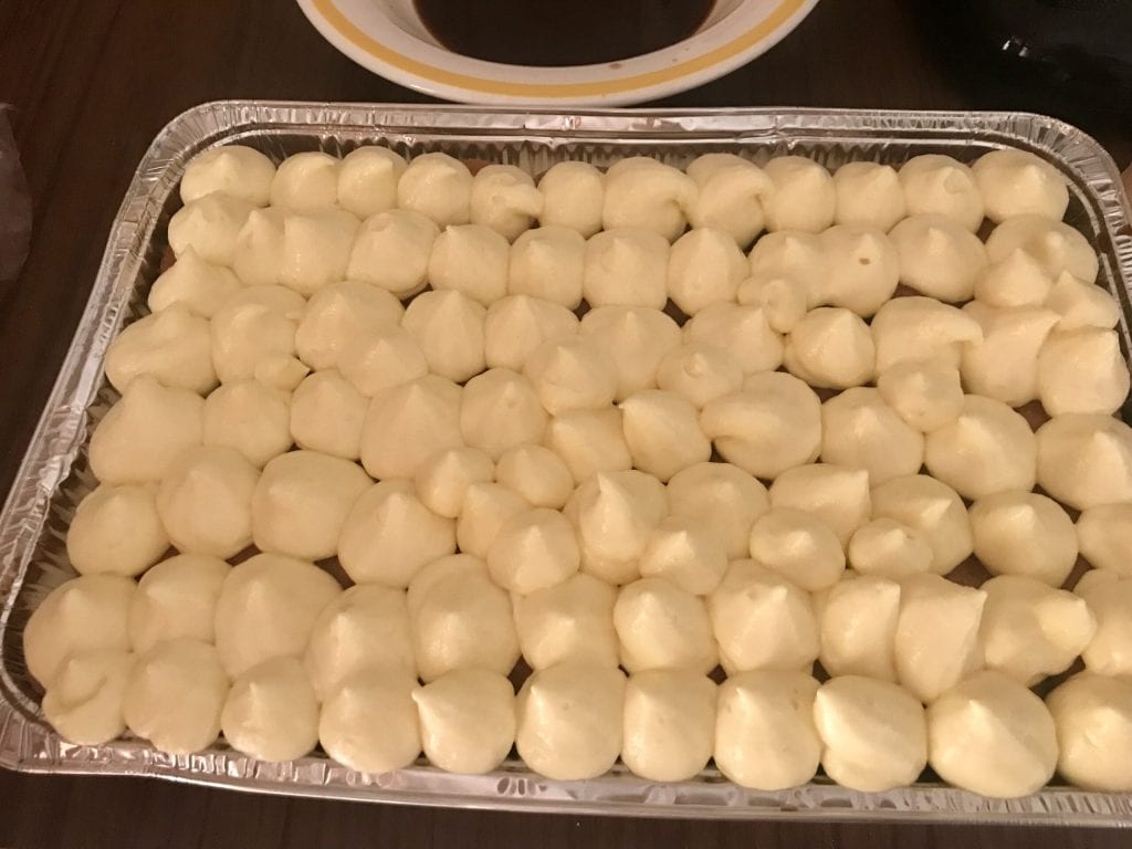 Bedek de hele bodem van de ovenschaal met de koekjes gedoopt in koffie en bedek ze met de mascarponeroom die je hebt bereid (ik gebruik een spuitzak voor gemak, maar je kunt de room ook gewoon met een lepel aanbrengen).