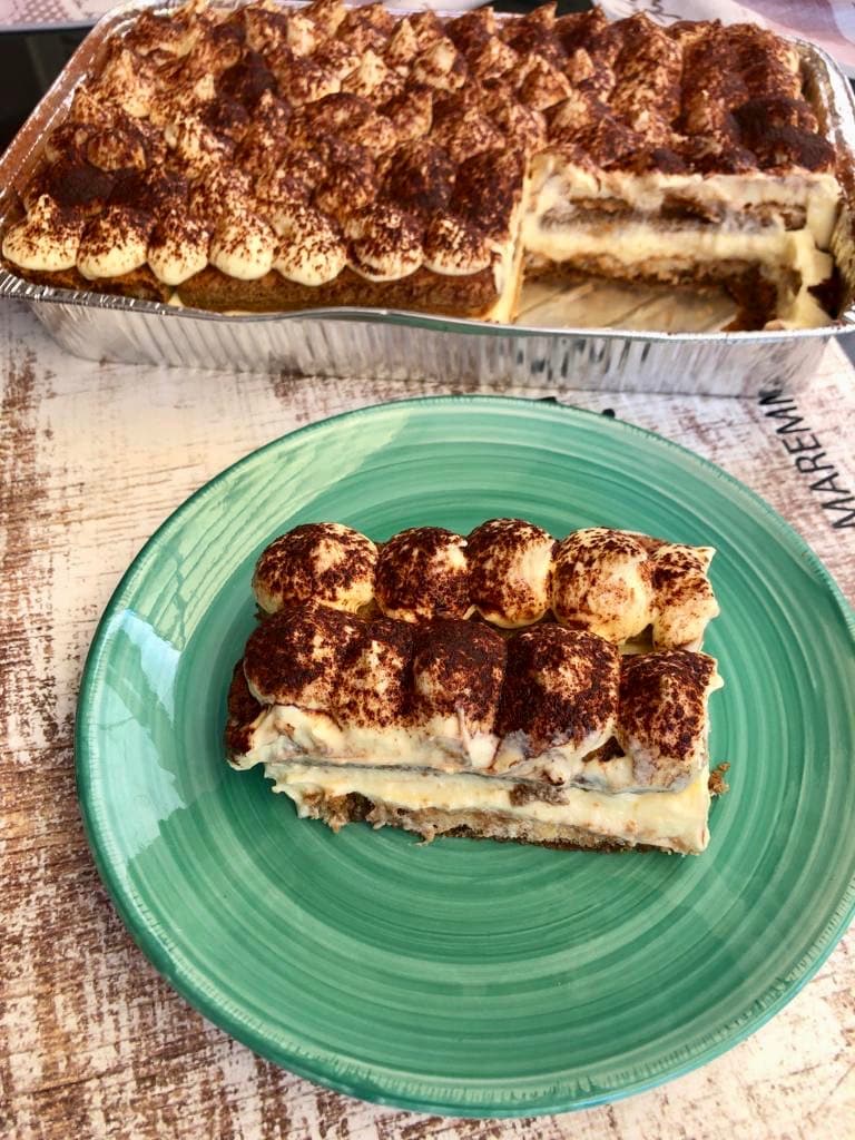 Zoals je kunt zien aan de portie van het dessert, blijft de room, als deze goed is voorbereid, minstens twee dagen stevig in de koelkast en de koekjes, als je ze goed hebt gedoopt, zijn sponsachtig en zullen tijdens het rusten geen koffie in de schaal loslaten.