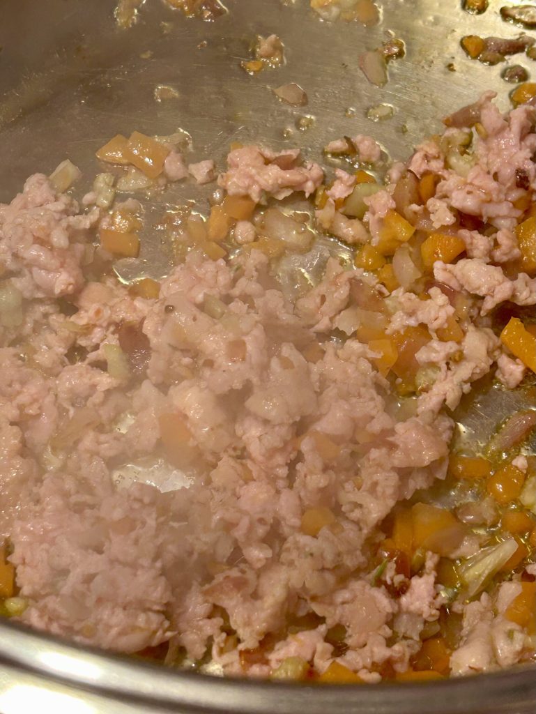 Wanneer de soffritto goed goudbruin is, voeg de twee worstjes toe, ontdaan van hun vel en in stukjes gesneden. Gebruik een soeplepel of vork om de worstjes zoveel mogelijk te verkruimelen en laat ze een paar minuten koken.