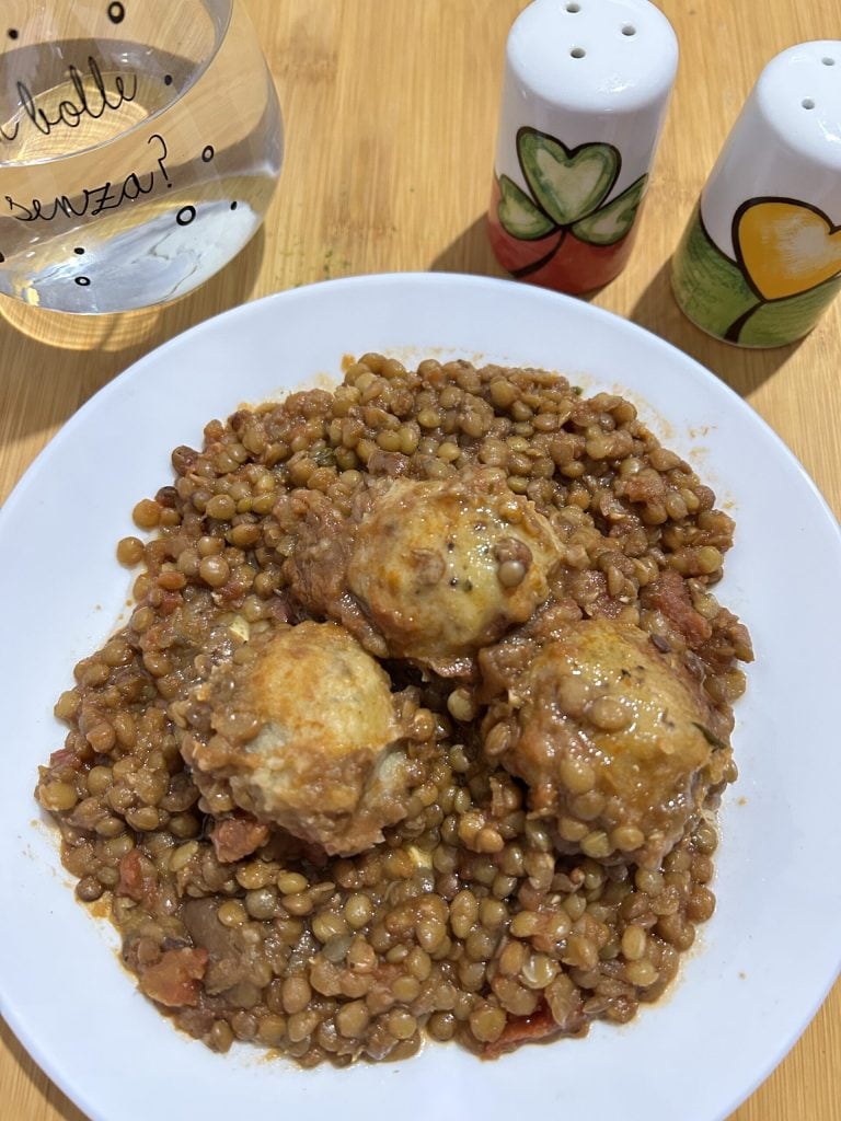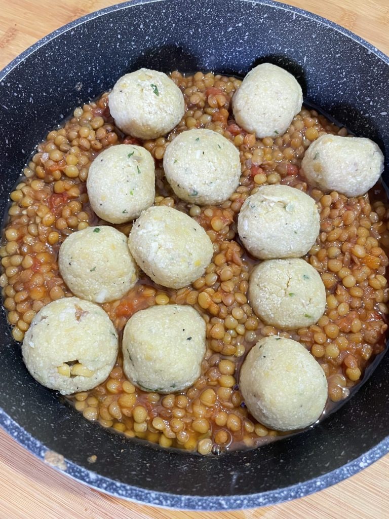 De linzen heb ik gekookt door te starten met een soffritto van groenten, waaraan ik eerst de linzen heb toegevoegd en daarna tomaat en water om ze te koken. Je kunt het proces zien in dit recept. Toen de linzen gaar waren, heb ik de balletjes voorbereid, ze bij de saus gevoegd en het geheel een paar minuten laten samenkomen. Let op dat wanneer je de balletjes toevoegt, de saus kan intrekken omdat de balletjes erg sponsachtig zijn en rijk aan zetmeel, dus als de saus intrekt terwijl je de balletjes met linzen smaak geeft, voeg dan een beetje water toe.