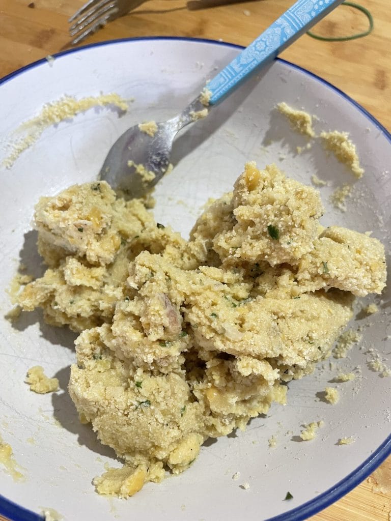 • Meng alles met een vork, controleer de consistentie en voeg zoveel paneermeel toe als je nodig hebt om de balletjes met de handen te kunnen vormen. Bedenk dat aardappelen en kikkererwten al vrij stevig zijn, dus er zal weinig paneermeel nodig zijn. Paneermeel is vooral nodig om het deeg te binden, het niet te laten breken tijdens het koken en om niet aan de handen te kleven terwijl we de balletjes vormen. Als je deze handeling wilt vergemakkelijken, kun je je handen licht oliën terwijl je de balletjes vormt, maar dit was voor mij niet nodig.