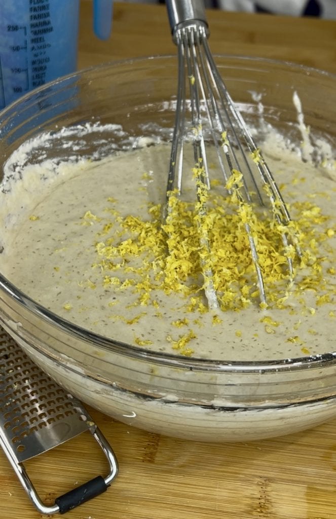 Giet de fruitpuree en de ruwe suiker in een grote kom. Voeg de resterende water toe en meng met een handgarde. Voeg de zonnebloemolie toe, en voeg vervolgens geleidelijk de bloem toe, terwijl je blijft mengen om klontjes te voorkomen. Voeg de geraspte citroenschil toe en ten slotte het bakpoeder. Zodra het deeg glad en homogeen is, is het klaar om te bakken.