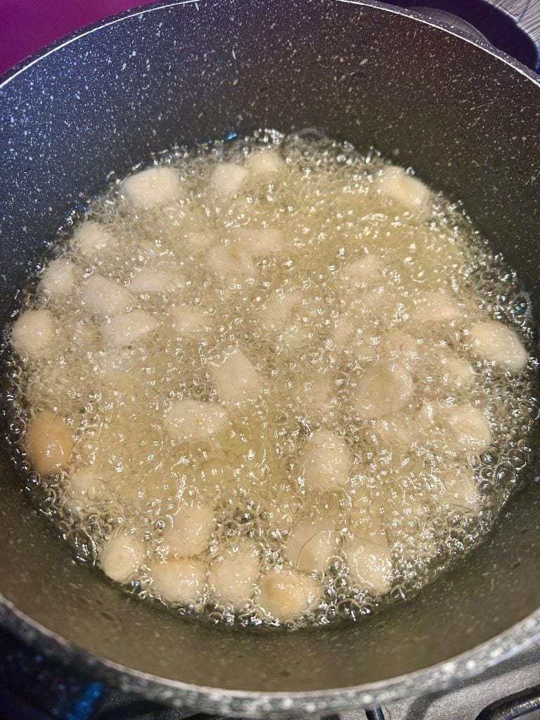 Als je begint met het snijden van de struffoli, is het tijd om de olie om te frituren op het fornuis te zetten. De olie moet goed heet zijn voordat je begint met frituren. Om de temperatuur te testen, doop je een tandenstoker in de olie: als er bubbels omheen ontstaan, is de olie klaar. Anders wacht je nog even. Frituur de struffoli beetje bij beetje, zodat ze de ruimte hebben om te rijzen en te bruinen zonder elkaar te overlappen. Wanneer ze goudbruin zijn, haal je ze eruit met de schuimspaan, laat ze goed uitlekken, en ga verder met het frituren van de rest van het deeg.