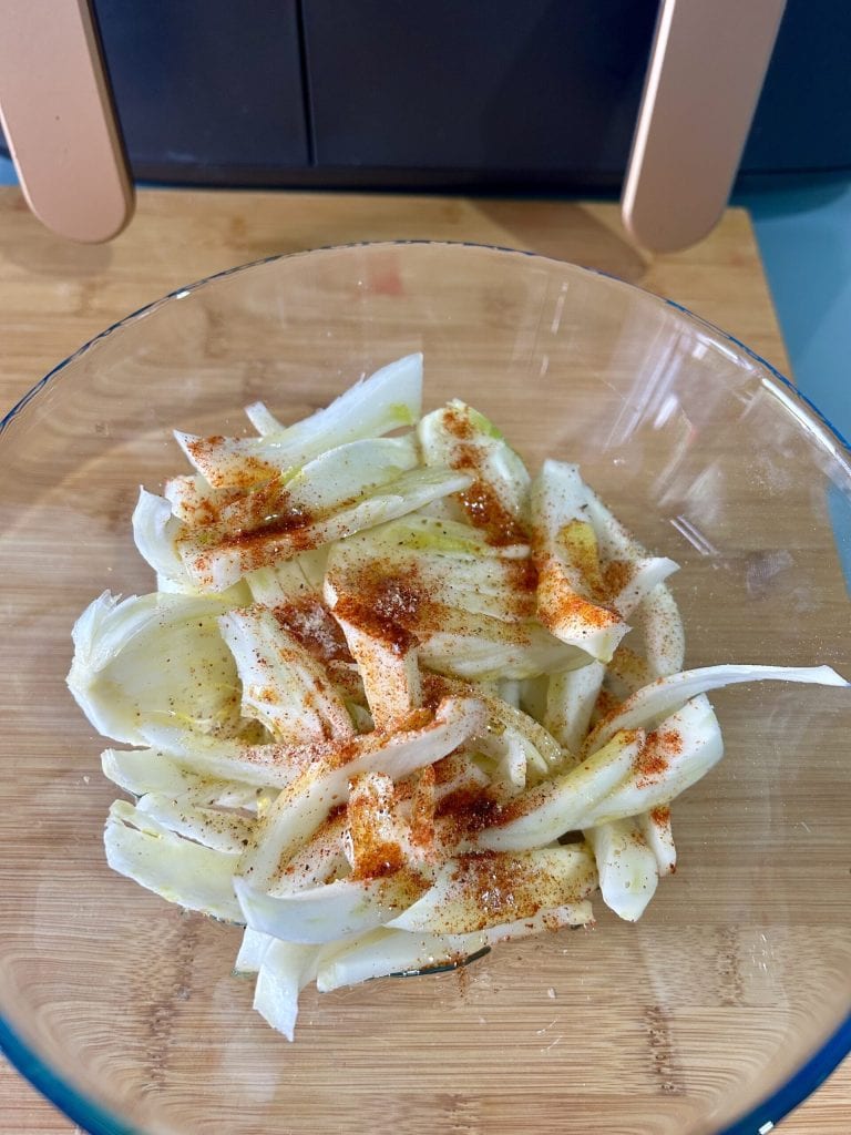 • Plaats de venkel direct in de mand van de heteluchtfriteuse en bak het ongeveer 10 minuten op 180 graden. Controleer halverwege en indien nodig, meng lichtjes. De venkel is klaar als het goed goudbruin is.