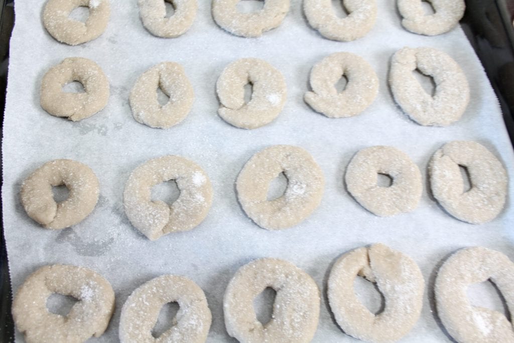 • Maak je geen zorgen als de ringen een beetje plat worden terwijl je ze in de suiker rolt; ze zullen tijdens het bakken weer opzwellen. Leg ze op de bakplaat, met een tussenruimte van 3-4 cm tussen elkaar om de rijzing mogelijk te maken. Bak ze in een voorverwarmde oven en bak ze ongeveer 25 minuten. Ze zijn klaar wanneer, bij het optillen van een ring, de onderkant goudbruin moet zijn. Haal ze uit de oven en laat ze afkoelen voordat je ze serveert.