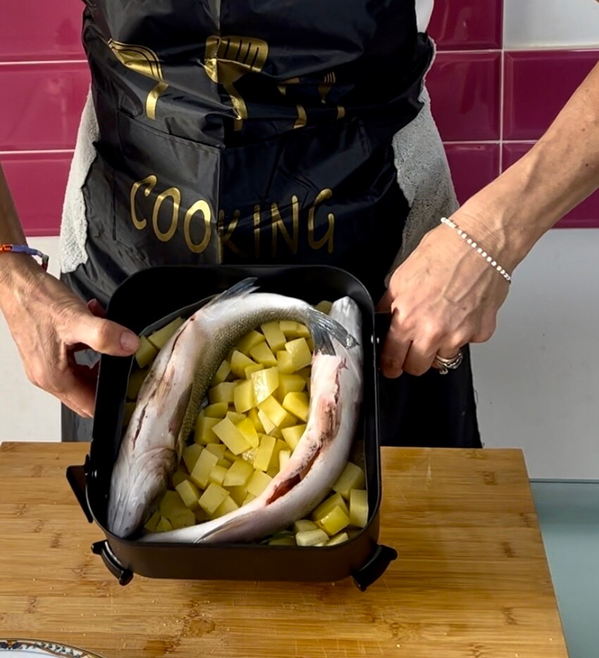 • Eenmaal schoongemaakt, breng de vis op smaak in de zak die u onder de buik hebt gemaakt met zout, peper en knoflook. Plaats de vis tussen de aardappelen, buig hem een beetje om hem goed in de bakvorm te krijgen, en start de kooktijd op 180° voor ongeveer 35 minuten.