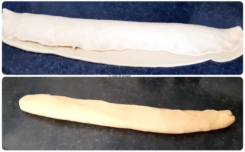 • Neem het eerste balletje deeg en rol het uit tot een strook van ongeveer 35-40 cm lang, strooi er een deel van de noten overheen (alles moet voldoende zijn om alle 6 de uitgerolde balletjes te vullen), vouw de rol over zichzelf en rol het dan een beetje op.