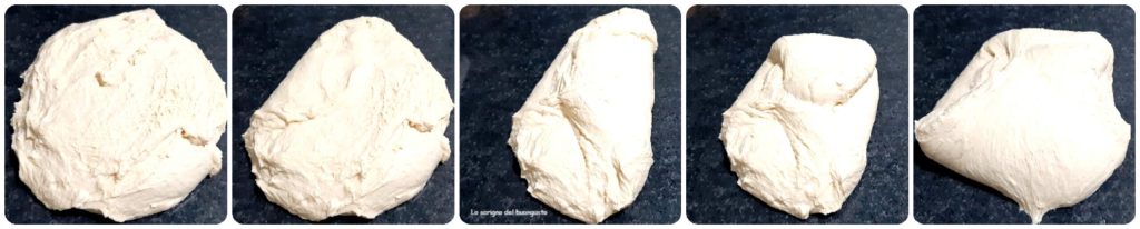 Na de tijd, leg het deeg op een met bloem bestoven werkvlak, neem elke kant van het deeg en breng het naar binnen zoals op de foto, draai het dan om op de werkbank