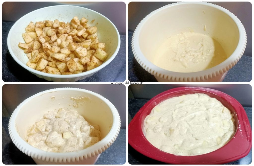 • Bereid mijn appelcake met speltmeel door eerst de appels te schillen en in blokjes te snijden. Breng ze op smaak met 2 eetlepels suiker, de kaneel, het citroensap, de rum en meng goed; zet vervolgens even apart.