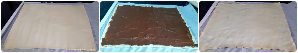 Rol de eerste rol bladerdeeg uit, smeer de Nutella over het hele oppervlak, rol de tweede rol uit en leg deze op de Nutella.