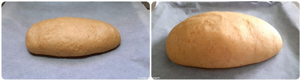 Als het gerezen is, leg het op een werkvlak en geef het met behulp van een beetje bloem de vorm van een brood en plaats het op een met bakpapier beklede bakplaat en laat het nog minstens een uur rijzen, of in ieder geval tot het weer gerezen is.