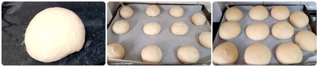 Verdeel het deeg nu in 14 stukken van ongeveer 95 gr, vorm de balletjes en plaats ze op een anti-aanbak bakplaat of bedekt met bakpapier.