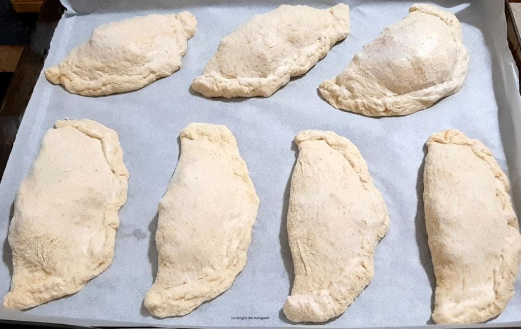 Herhaal de handeling voor elke calzone, leg ze op een met bakpapier beklede bakplaat en bestrijk ze met extra vierge olijfolie.