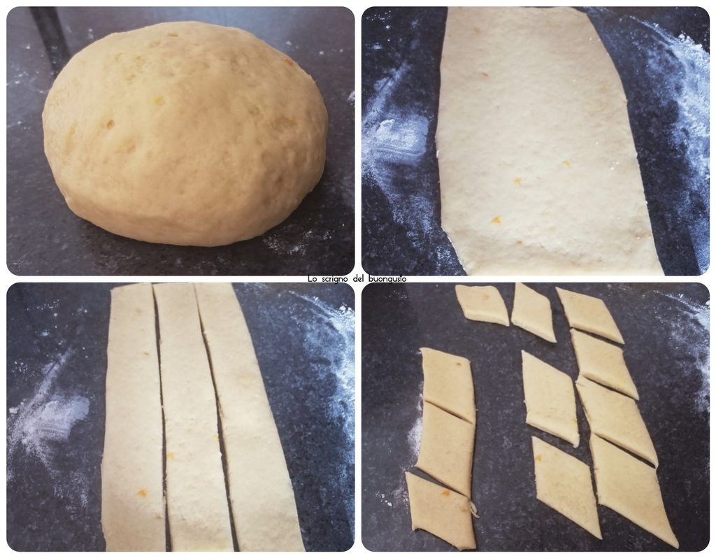 Snijd het deeg in stroken om vervolgens rechthoekige schuine stukjes van ongeveer 4 cm breed en ongeveer 6 cm lang te verkrijgen.