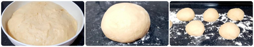 Na het rijzen, leg het deeg op een met bloem bestoven werkblad, maak opnieuw een bal en verdeel het in 8 gelijke delen.