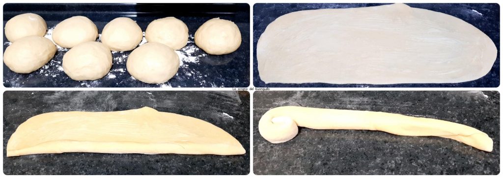 Na de rusttijd, neem elke bol en rol deze uit tot een lange en dunne strook deeg, bestrijk deze met boter en rol op vanaf de lange zijde.