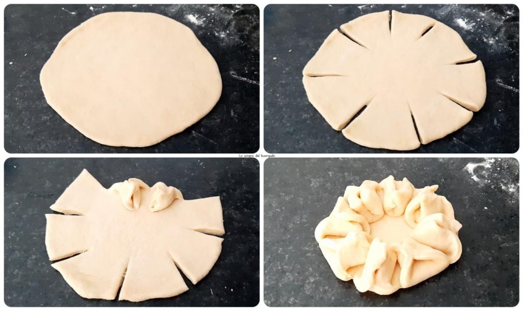 • Laat de balletjes 10-15 minuten rusten, druk ze dan plat met een deegroller en maak er kleine pizza’s van, snijd ze in tot ongeveer een halve vinger naar binnen en maak 8 inkepingen.