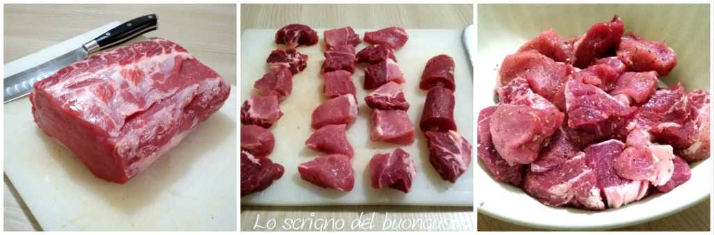 Neem het varkensvlees en verdeel het in 16 stukjes ter grootte van een walnoot of iets groter, bestrooi ze met laurier, zout, peper en knoflook, meng goed om het te laten smaken.