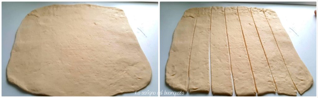 Op dit punt kunnen we de andere stroken nemen en er Nutella op smeren, waarbij we ze om elkaar heen wikkelen.