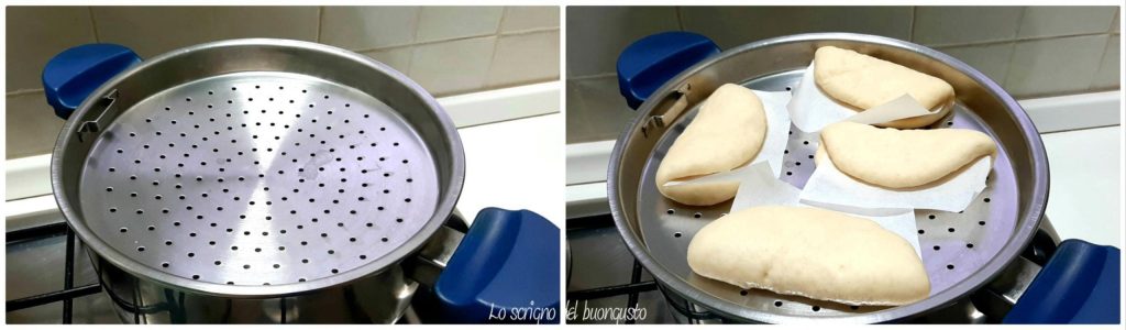 • Verwarm ondertussen de pan met water en een half glas appelazijn, plaats het stoomrek en zodra de bao klaar zijn, zet het gas laag, plaats ze op het rek en dek af met deksel.