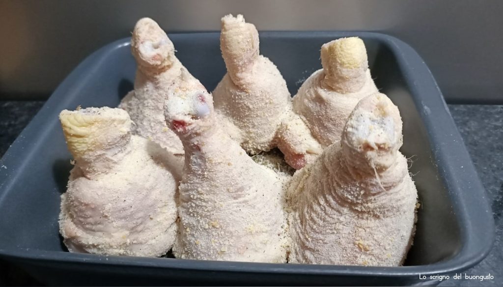 • Haal de drumsticks door het mengsel van paneermeel en zout en zet ze met de open kant naar de bakvorm (ze moeten rechtop blijven) met een beetje olie.