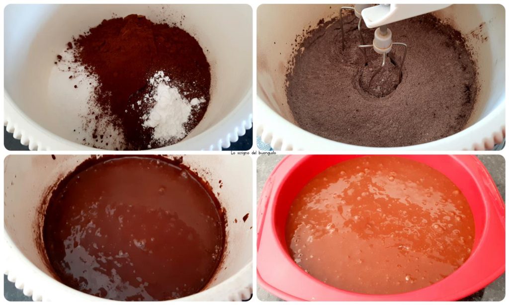 In de mixer voor desserts voeg de bloem, suiker, cacao, bakpoeder toe en meng.