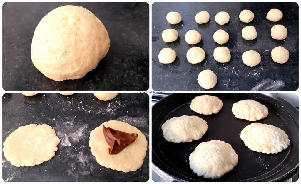 Druk elke bal plat om een kleine pizzetta te krijgen, vul met een theelepel Nutella, druk een andere pizzetta in en leg deze bovenop de gevulde, goed afdichten en opzij zetten.
